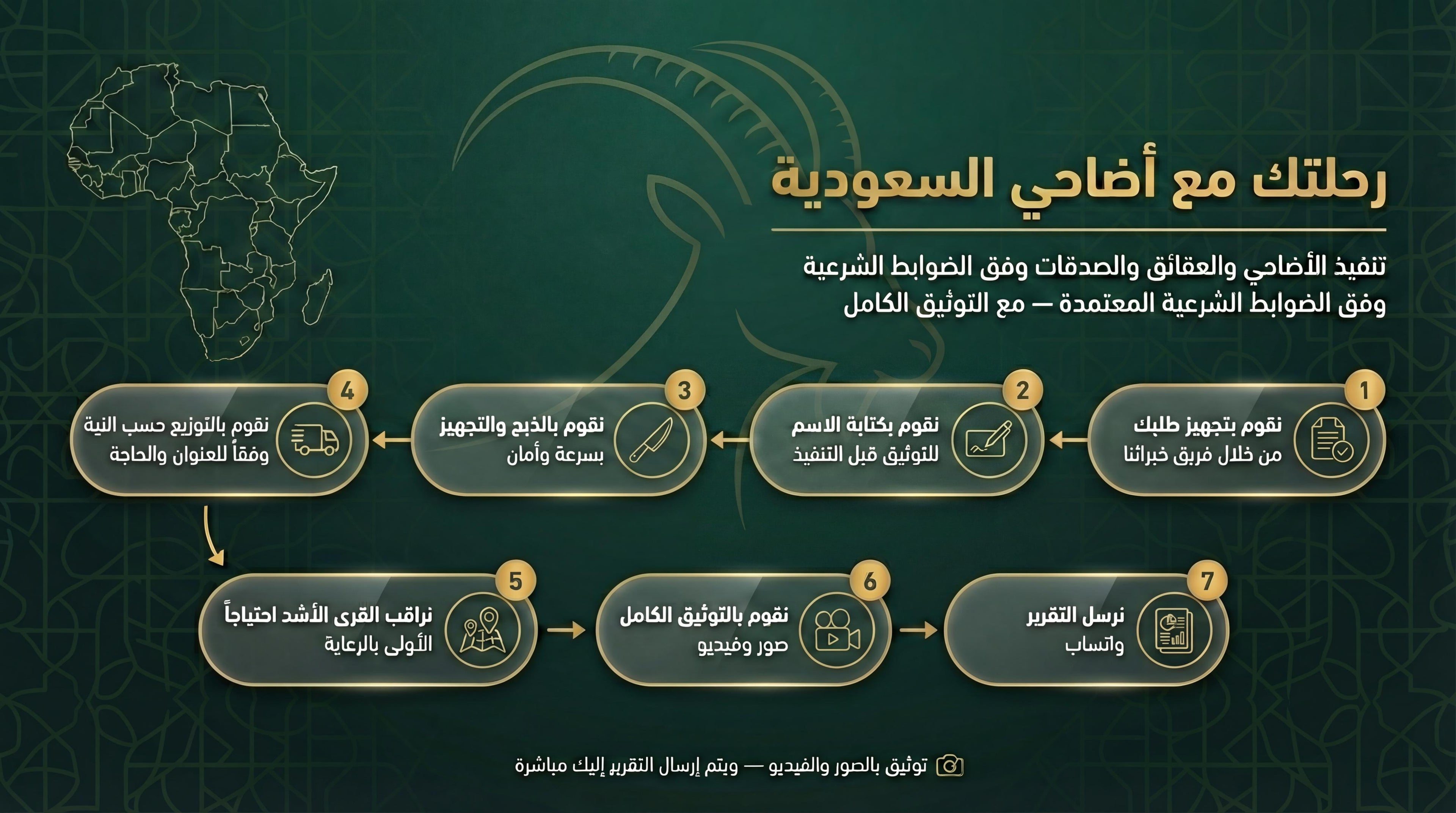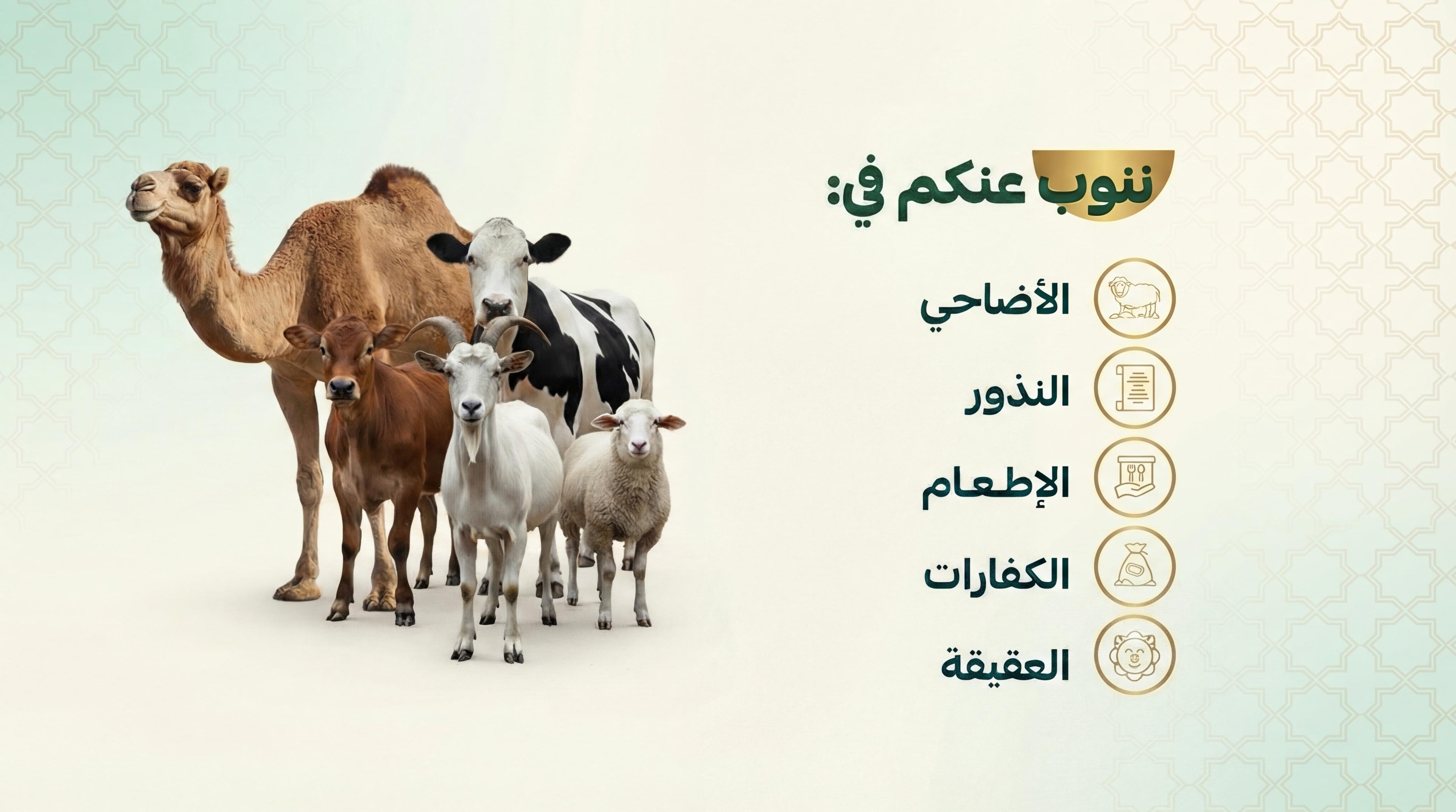 نختار الذبيحة السليمة شرعاً، نكتب اسمك عليها، ونذبحها بإشراف لجنة شرعية مختصة.